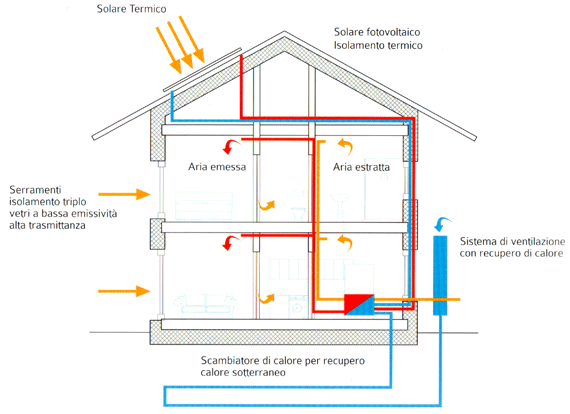 Una casa tradizionale consuma dai 120 ai 250 kwh/m2 per anno; il risultato ottimale a cui si può arrivare è rappresentato da un edificio che ha un indice termico inferiore a 60 kwh/m2 per anno e consuma solo 6 litri di gasolio, ovvero 6 metri cubi di gas per metro quadro all’anno. |
